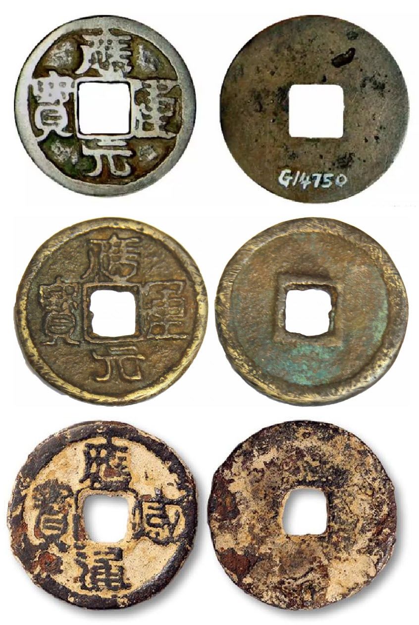 Сверху-вниз: yīng yùn yuánbǎo из Шанхайского музея, он же из частной коллекции, yīng gǎn tōng bǎo из Национального музея Китая