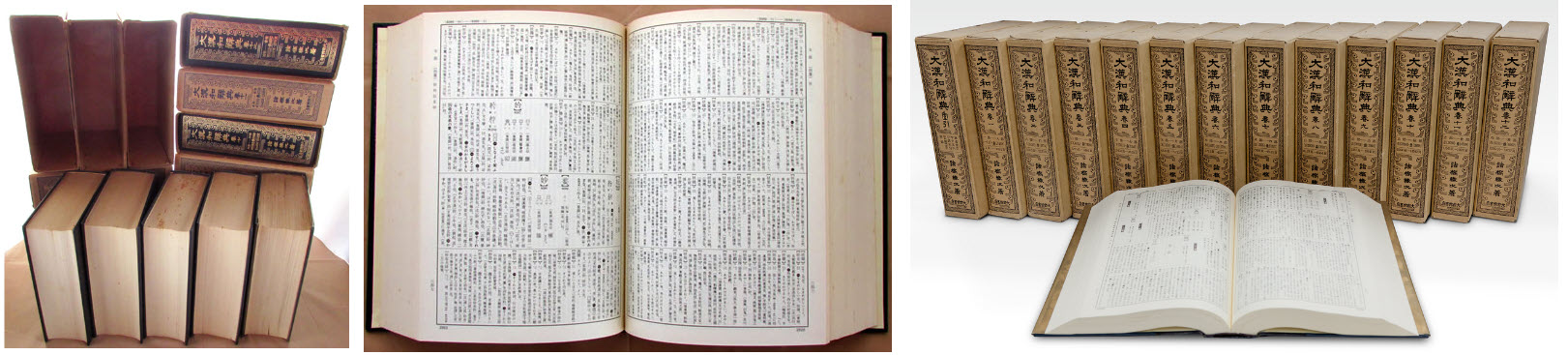 Другие страны синосферы тоже не отстают. Идея «Великого китайско-японского словаря» Dai Kan-Wa Jiten (大漢和辞典) пришла в голову синологу Морохаси Тэцудзи (諸橋 轍次) в 1917 г., когда он поехал учится в Китай и, по воспоминаниям, тратил треть своего времени на то, что бы найти какой-то редкий иероглиф. Существующие словари не могли ему помочь в силу своей убогости, в результате он вернулся в Японию с 20 толстыми тетрадями, заполненными китайскими словами и понял, что нашел дело своей жизни. Процесс длился с 1925 по 1960 г., пришлось делать все с нуля: от перелопачивания тонн литературы до разработки и изготовления шрифтов для иероглифов, которые еще никто в мире не печатал. В 1943 г. Токио был сожжен бомбардировкой и все шрифты и наборные формы погибли, пришлось воссоздавать их заново, но итогом стал невероятный труд – 13 томов, более 530 тысяч слов! В 1982 г. было опубликовано еще два дополнительных тома.