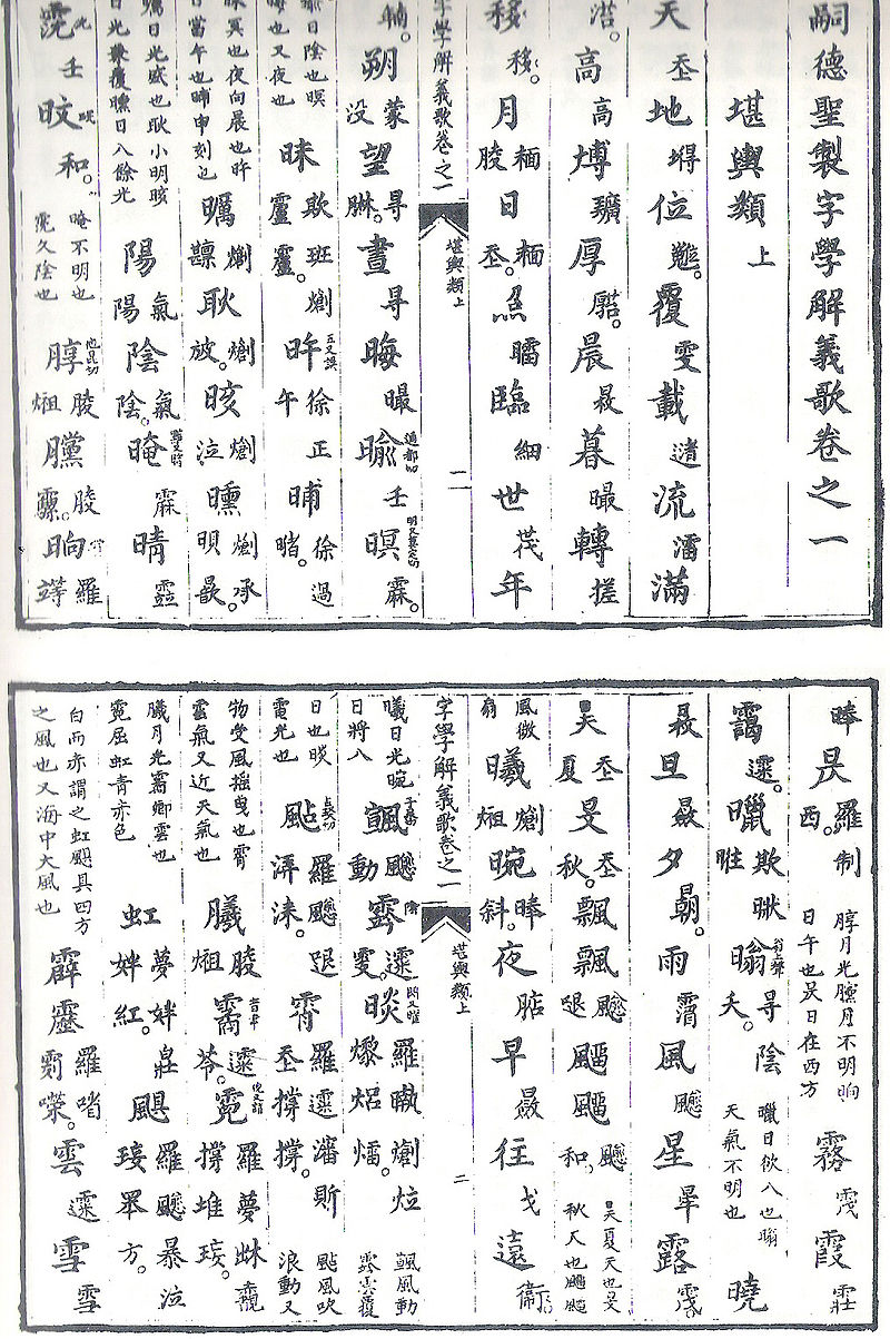 Страница из Tự Đức Thánh Chế Tự Học Giải Nghĩa Ca (嗣德聖製字學解義歌), книги XIX в, предназначенной для обучения детей китайским иероглифам. Написано императором Зык-тонгом (Nguyễn Dực Tông), правившим под девизом Tự Đức, 4-м из династии Нгуен.