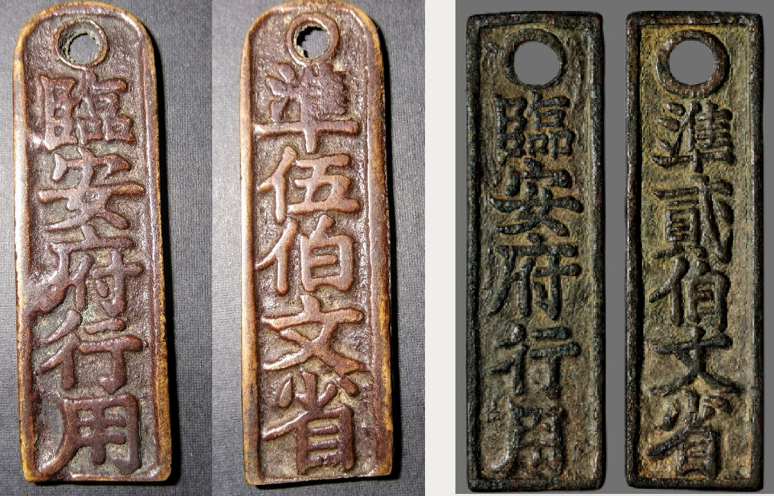 Цань паи из Линьаня одинакового номинала, но немного разной формы. Отлиты из бронзы во время правления императора Ли-цзуна, примерно в 1241-1252 гг.