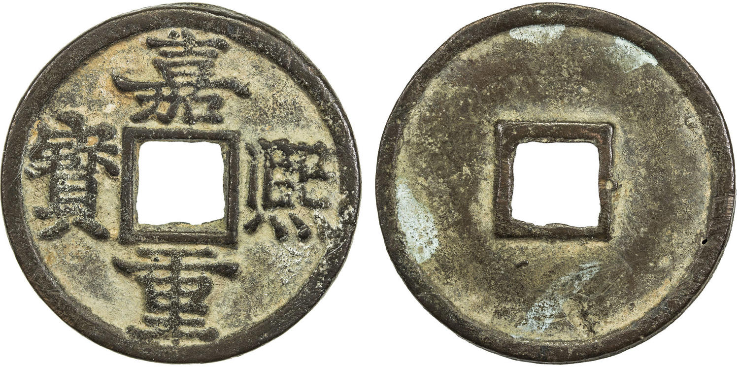 Монеты этого девиза считаются одними из самых красивых среди выпусков Южной Сун. Вообще монеты Юга менее популярны, нежели монеты Севера, хотя их и существуют сотни разновидностей, как из меди, так и из железа. Эта монета (что редкость) была продана на аукционе в Калифорнии в 2018 г. за $140. Диаметр 35 мм, вес 9,65 гр. На аукционах в Шанхае они, обычно, торгуются в районе $60-150. Отметим, что надвиси на почти всех монетах Нин-цзуна и абсолютно всех - Лин-цзуна выполнены обычным шрифтом.