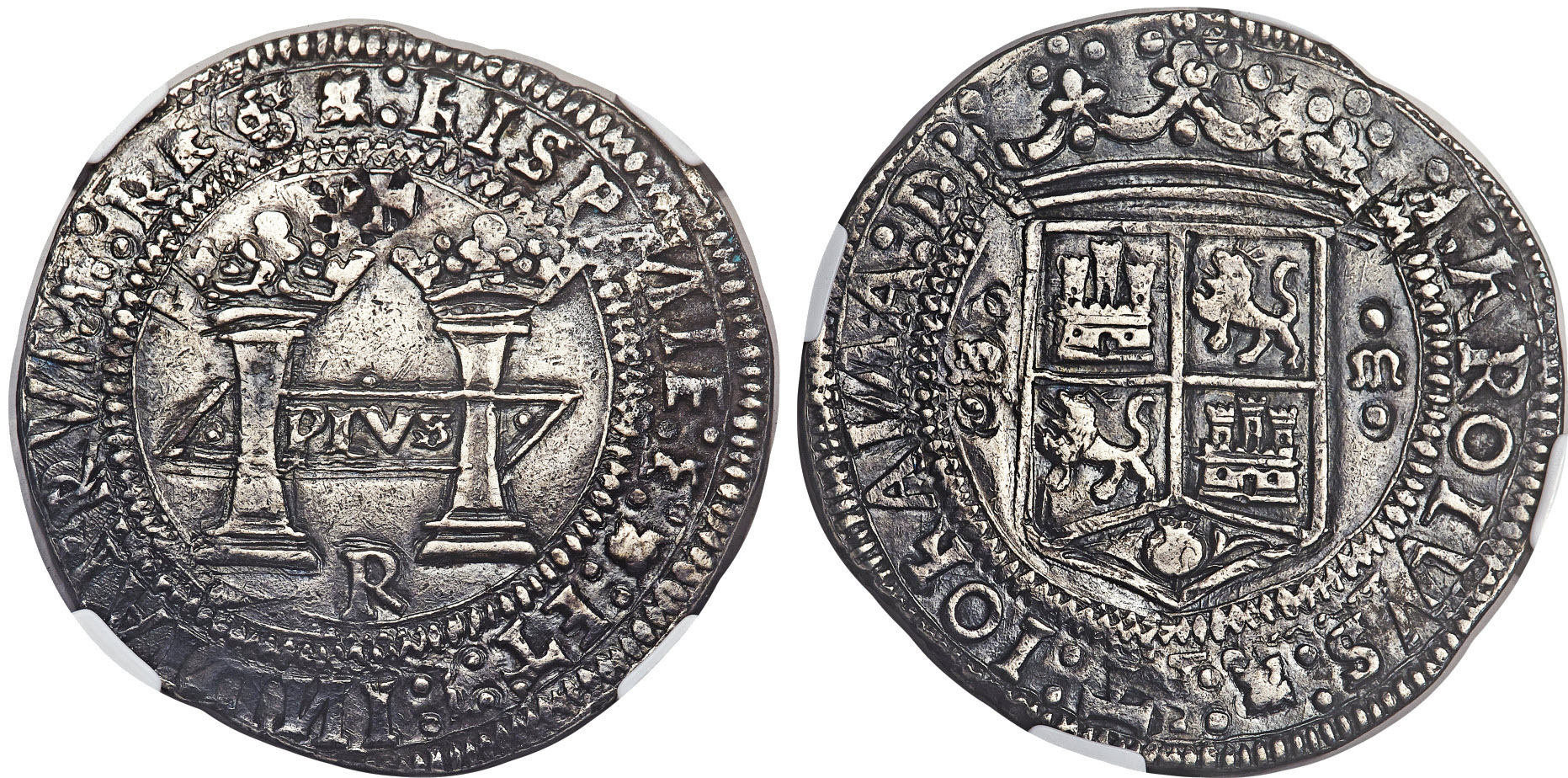 Выпущена в 1536 г. во время регенства Карла V (первого и последнего человека, объединившего под одной короной Латинскую Америку, Пиринейский полуостров и Священную Римскую империю, хозяина половины планеты) и Хуаны I Безумной. Ценность конкрето ее в том, что это самая ранняя монета размером с крону, отчеканенна в Новом Свете - прадедушка всех долларов. Долгое время их выпуск считался мифическим, пока в 1990 г. не был обнаружен и поднят галеон Golden Fleece, затонувший в 1550 г. Три монеты были последовательно проданы в 2004, 2006 и 2014 г., а эта - перепродана в 2018 г. за колоссальные $528,000. По монете отчетливо видно ее мексиканское происхождение и работа местных резчиков: следы двойного удара штемпелей во многих местах (подтверждающие воспоминания современников, о том, что такие огромные монеты было сложно прочеканить, как-никак 36.5 мм и 27.13 гр!), безграмотная легенда (например, IOhAИA вместо JUANA) говорящая о том что дизайн разработали сами работники двора в Мексике и они же вырезали штемпели, старый готический шрифт буквы М. С исторической точки зрения это чрезвычайно важная монета - первая колониальная, демонстрирующая претензии Испании на мировое экономическое и политическое господство. Чеканка первого образца продолжалась всего с 1536 по 1542 г. до тех пор, пока из Испании не привезли новый официальный набор пуансонов (небольших штампов из закаленной стали, которыми в штемпель вбивали отдельные элементы дизайна монеты: гранат, замок, льва, буквы и т.п.). Какое отношение испанские доллары имеют к династии Мин - вы узнаете ниже.