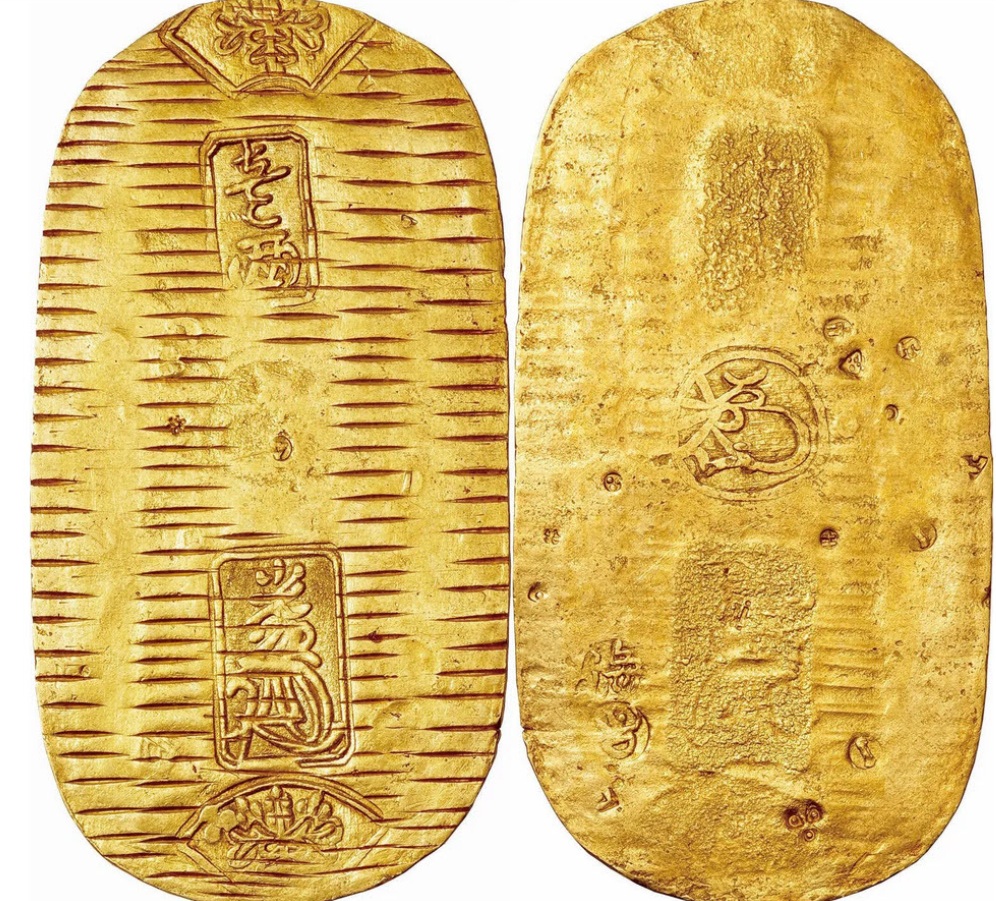 О экономическом могуществе сёгуната говорит тот факт, что с 1588 г. японцы стали изготавливать свои знаменитые золотые монеты обан (колоссальным номиналом в 10 рё — 165 гр. золота!) и кобан (1 рё — 16.5 гр. золота). Постепенно качество обанов и кобанов падало настолько, что к XIX в. фальшивые монеты (с меньшим содержанием золота) прежних веков стали ценится дороже настоящих монет нынешнего времени. На фото потрясающий Кейчо Кобан (慶長小判金) одной из первых серий (1601–1695 гг.), 71 мм длиной, 17.73 гр., продан за $11464.