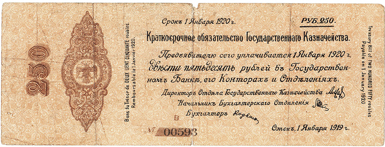Краткосрочное обязательство Государственного Казначейства. 250 руб. Омск. 1 января 1919 г. Аверс. Фальшивое