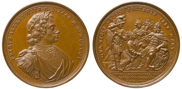 На лицевой стороне погрудный портрет Петра I в доспехах, плаще и лавровом венке вправо, в обрезе руки «Н.» (Хаутч), у края слева «G F N» (Георг Фридрих Нюрнберг), по кругу «PETRVS ALEXEEWITZ. M.D. TZAR M.D. MOSCOV.» (Петр Алексеевич Великий Князь, Царь, Великий Князь Московии). На оборотной Петр I изображен передающим свиток коленопреклоненной женщине, олицетворяющей Азов, между ними аллегория мира – женская фигура с рогом изобилия, справа над обрезом «Н.», по кругу «QUA VICIT VICTOS PROTEGIT ILLE MANU. CLAVD.» (Той же рукой, какой победил, защищает побежденных. Клавдий), в обрезе «ѴІСТА. AZOF. MOSCHIS. 1696.- FACTA. CONCESSAQUE.- PACE. 1700.» (Азов покорен московитами в 1696, при том, что мир заключен и утвержден в 1700).