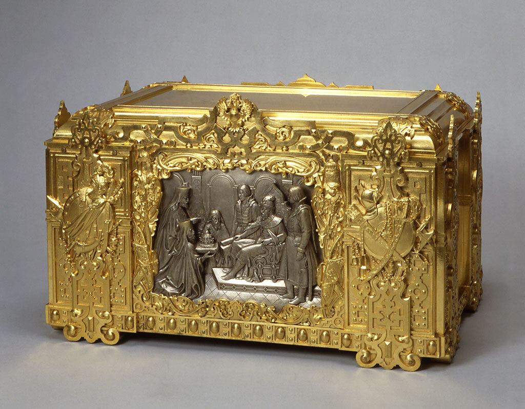 Один из семи ларцов-сейфов, предназначенных для хранения древнейших и наиболее важных государственных актов, договорных грамот, царских писем и других документов. Ларцы выполнены по проектам Ф.Г.Солнцева в 1852-1858 гг. для Государственного древлехранилища хартий, рукописей и печатей, созданного в 1851 г. в качестве отделения Оружейной палаты для хранения «актов истинно государственных».