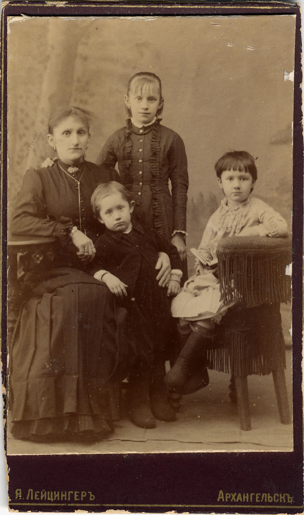 Фотограф Я. Лейцингер, Архангельск. Семейный портрет - мать и трое детей. 1890-е г.