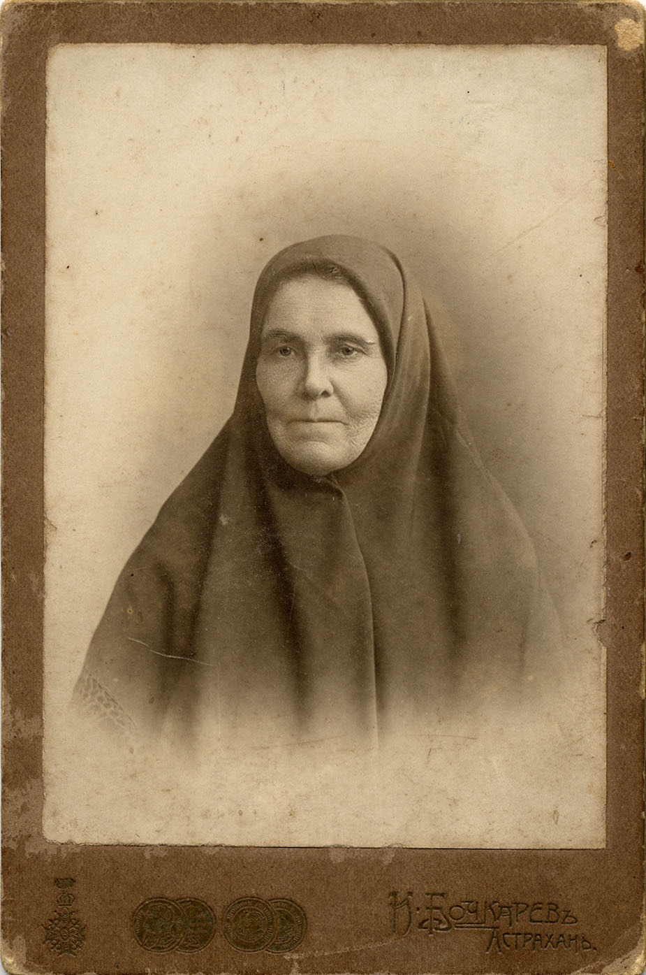 Фотограф И.М. Бочкарев, Астрахань. Портрет пожилой женщины в темном платке. 1900-е г.