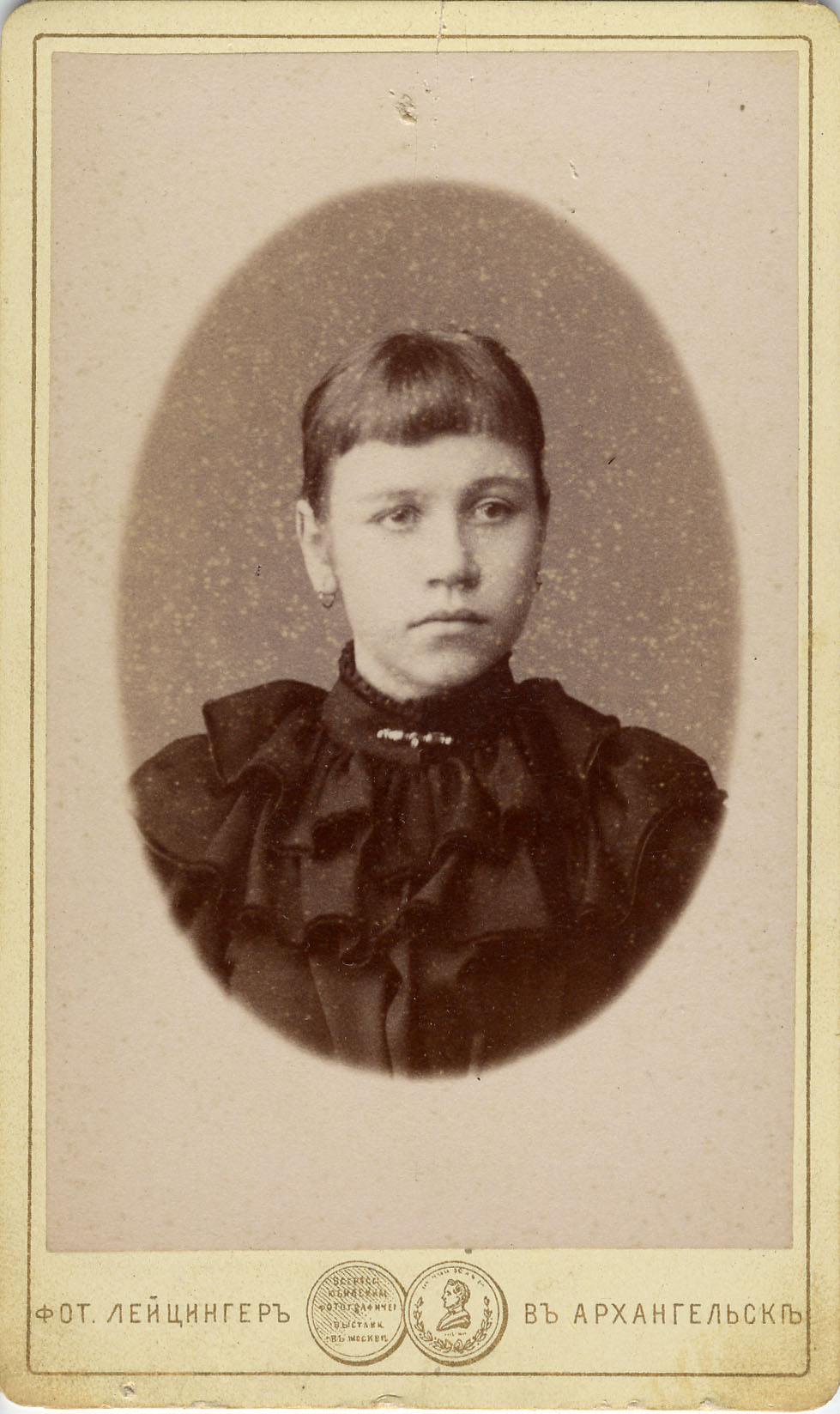 Фотограф Я. Лейцингер, Архангельск. Портрет девочки. На оборотной стороне надпись: “7 декабря 1893 года. Горячо любящим родителям на память от Мани”.