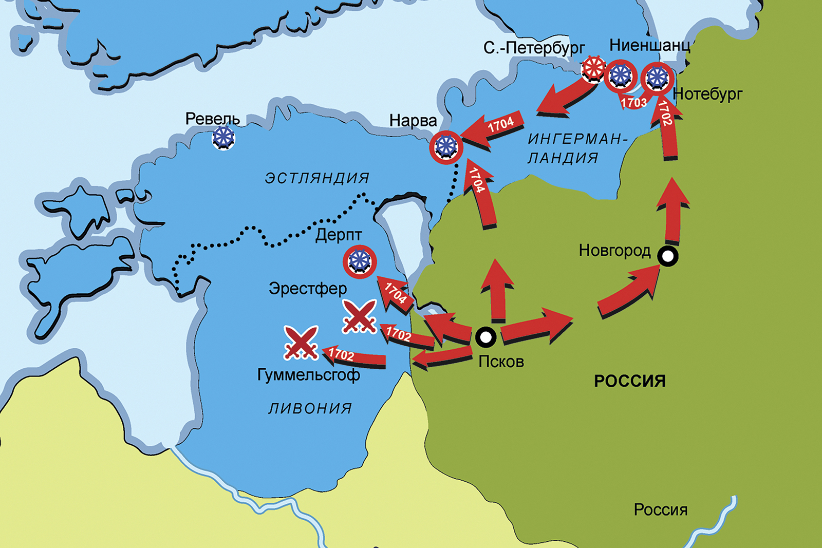 Карта кампаний 1701–1704 гг. Действия в Ингерманландии и Ливонии (Великая Северная война 1700–1721 гг.)