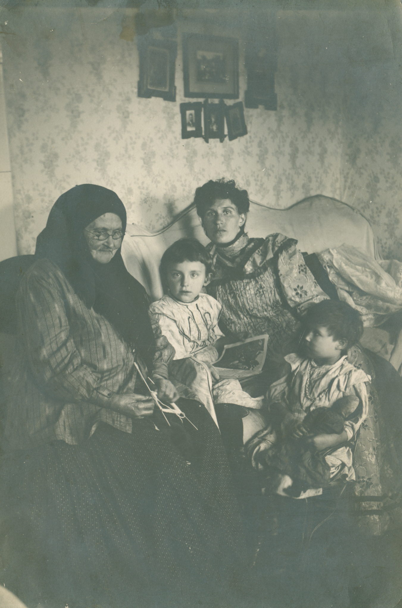 Фотоотпечаток 1960 г. с негатива П.И. Целебровского. «Бабушкины сказки» (жена, теща – Анна Кузьминична Усова и двое детей сидят на диване за чтением книг). 1907-1910- е гг. 17,6 х 13