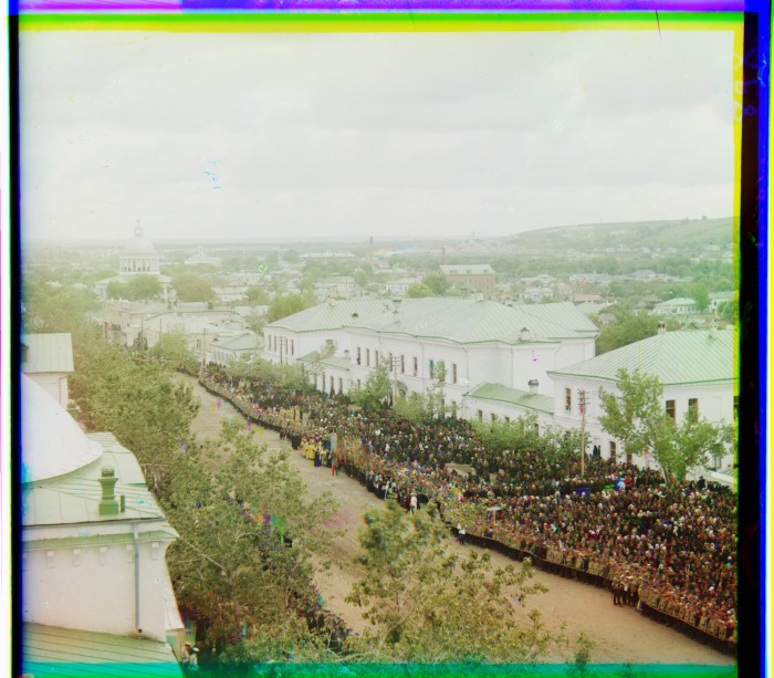 Вид с колокольни Белгородского Свято-Троицкого мужского монастыря на Соборную площадь во время торжеств прославления святителя Иоасафа Белгородского 4 сентября 1911 г. Справа - духовное училище (1807). На заднем плане - женский Рождество-Богородицкий монастырь.
