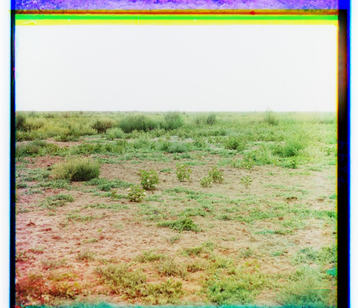 Бакинская губерния, Джеватский уезд, Муганьская степь. Николаевка. Резкий образчик двух соседних плановых участков. Солонец 3 раза сеян. Видны только отдельные кустики хлопка.