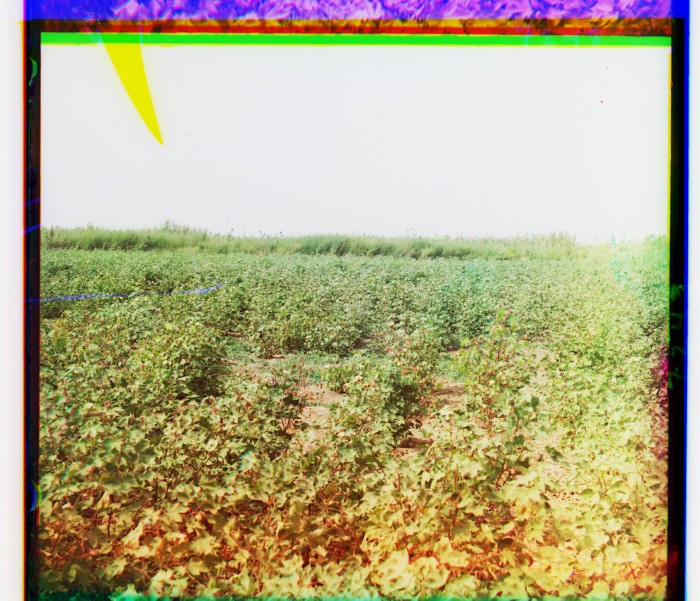 Бакинская губерния, Джеватский уезд, Муганьская степь. Хлопок. Впереди светлый и видны ряды - солонцовая почва. Дальше хорошая почва.