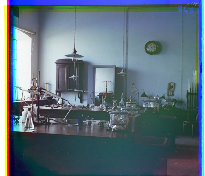 Лаборатория. По этой фотографии можно судить о времени и порядке экспозиции цветовых каналов. Благодаря разработанным Сергеем Михаловичем высокочувствительным эмульсиям, даже в слабо освещенном помещении общая экспозиция составила около трех минут. Отсюда можно предположить, что при солнечном свете она не превышала 5-10 сек - рекорд по тем временам. Кстати, экспозиция для разных каналов была разной и выбиралась фотографам исходя из практики.