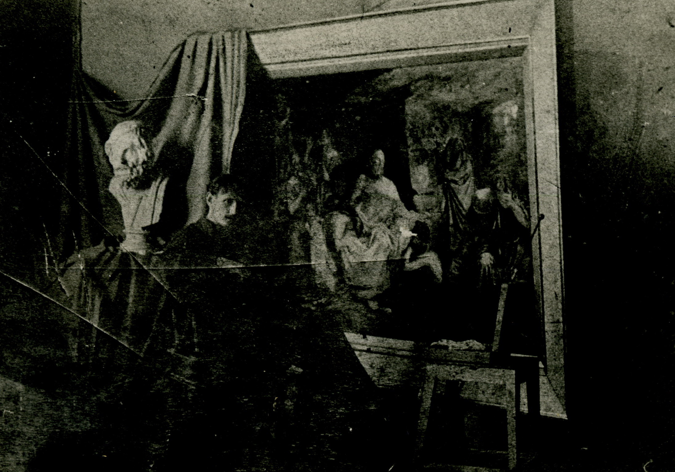 Художник Петр Целебровский около своей дипломной работы «Сократ в темнице». 1888 г.