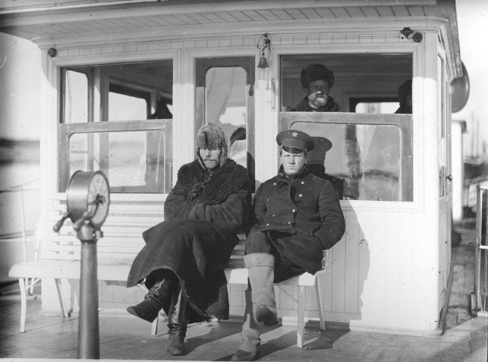 Члены экипажа парохода (подвахтенный и штурман) на ходовом мостике. Карское море. 23 августа - 1 сентября 1914 г.