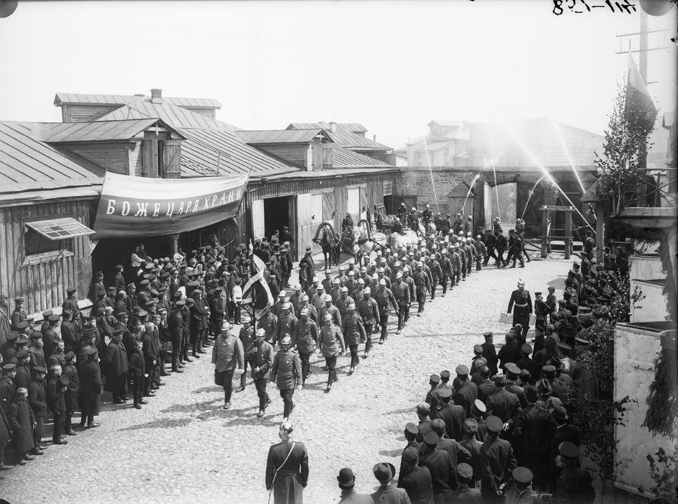 Сормовская вольно-пожарная дружина. Прохождение дружины со знаменем перед гостями. Автор: М.П. Дмитриев Место события: г. Н.Новгород Дата: 1910 г.