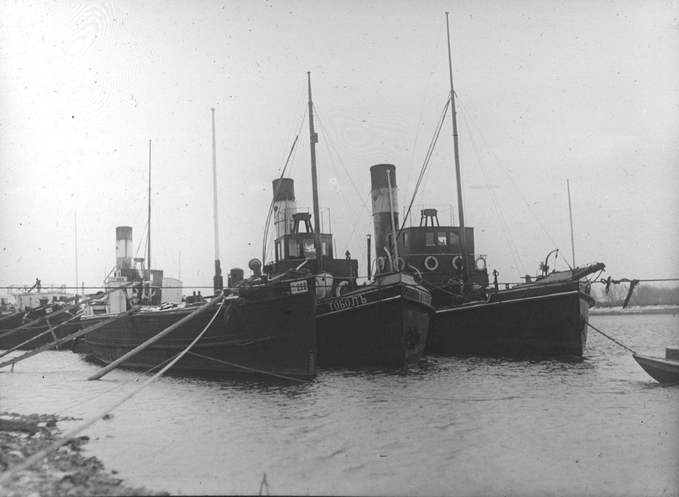 Вид на пароходы, пришвартованные у берега. В центре - пароход «Тоболъ». Автор: В.А. Зевеке Место события: г. Красноярск Дата: 29 сентября 1914 г.