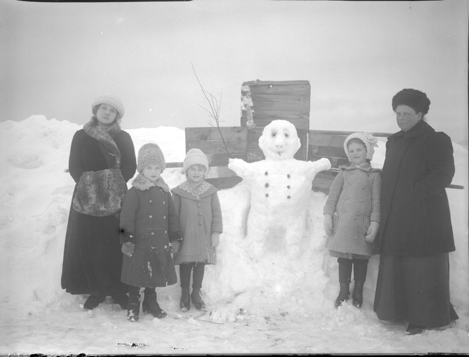 Групповой портрет. Две дамы и трое детей у снеговика. Автор: В.А. Зевеке Место события: г. Воткинск Дата: 1913 г.