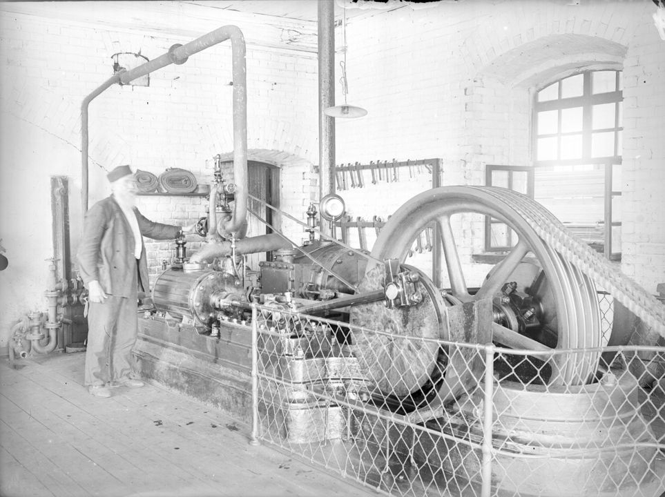 Общий вид паровой машины. Слева - неизвестный мужчина. Автор: В.А. Зевеке Место события: неизвестно Дата: б/д