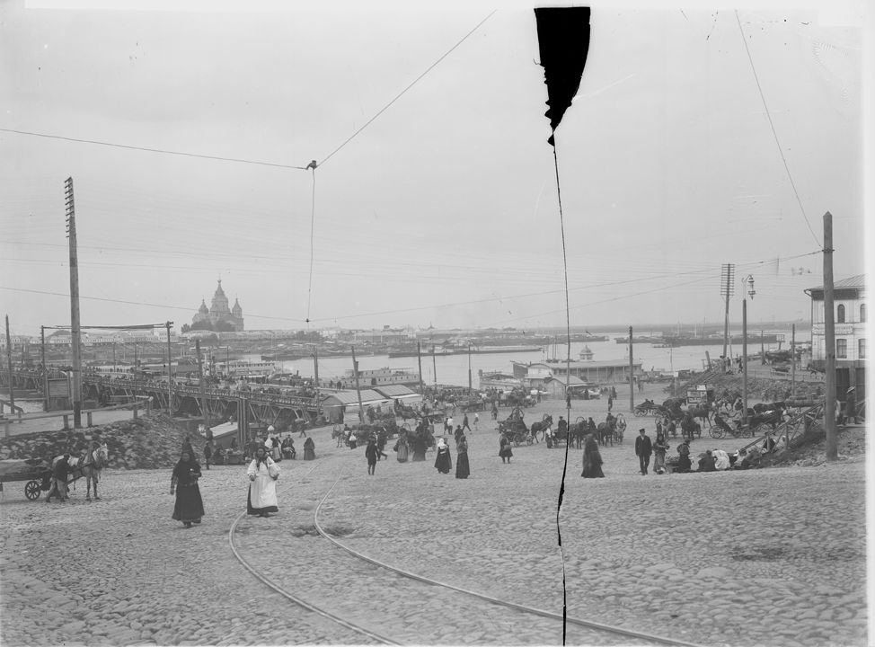 Общий вид на плашкоутный мост и ярмарочную сторону города. Дата: к. ХIХ в. – н. ХХ вв. Автор: М.П. Дмитриев Место съемки: г. Н.Новгород