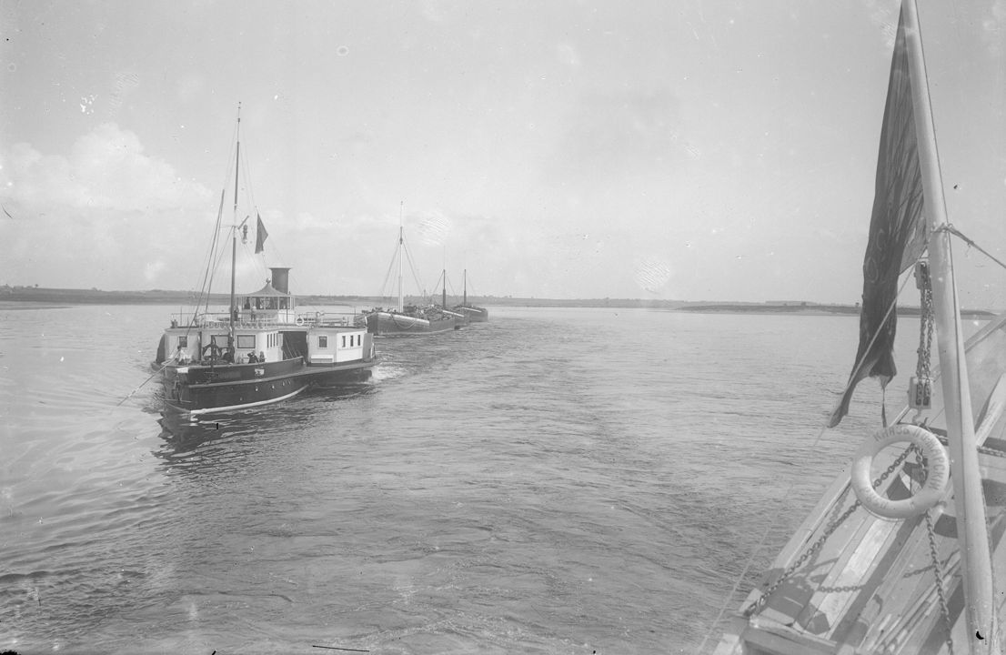 Рейд реки Волги. Буксирный пароход «Серебряков» ведет караван барж. Дата: 1913 г. Автор: М. Хрипков Место съемки: г. Н.Новгород