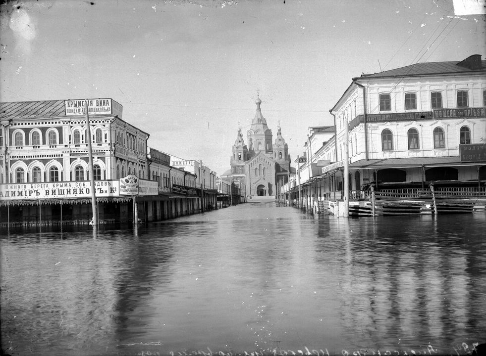 Нижегородская ярмарка во время половодья. Вид на Театральную площадь. Нижний Новгород.