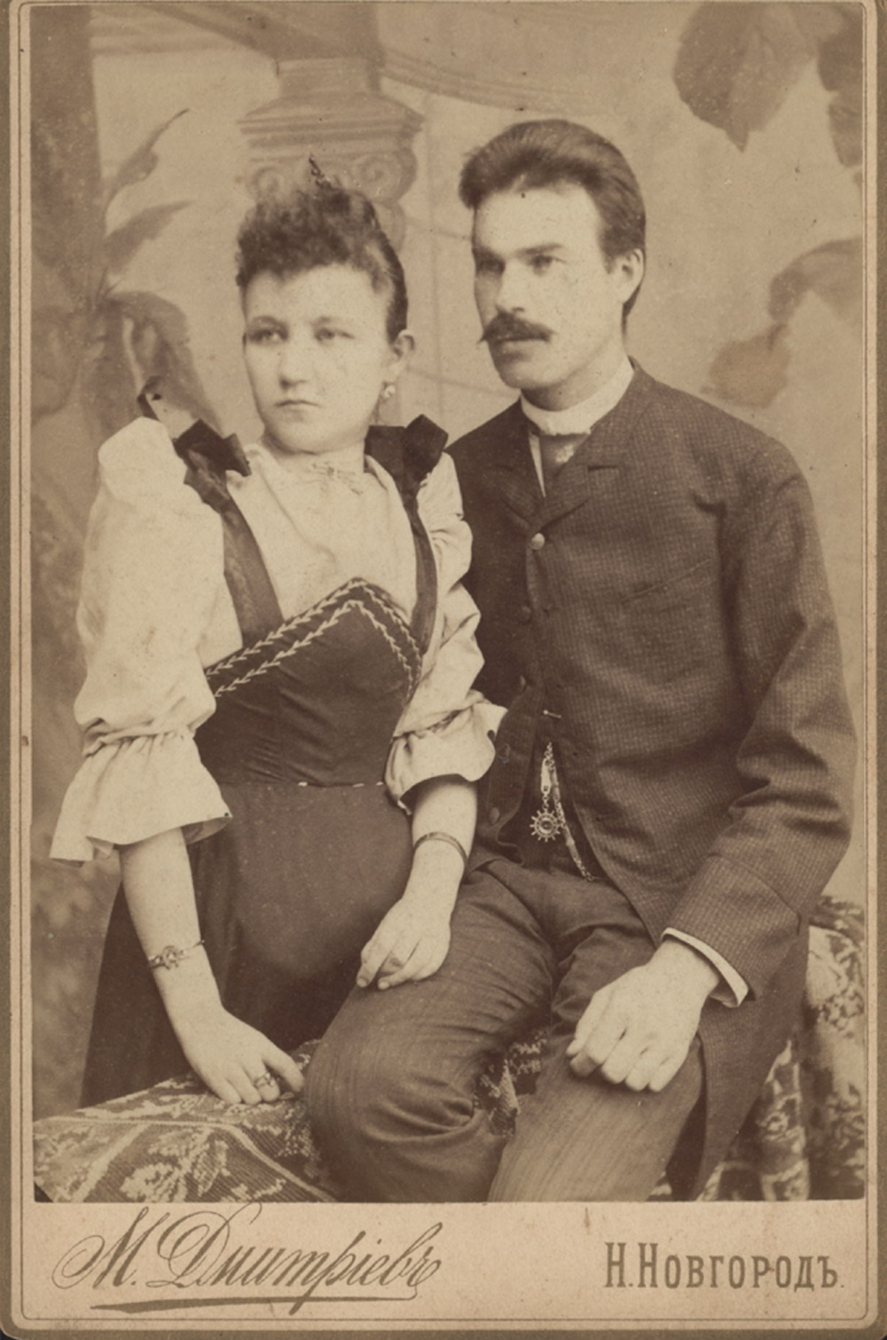 Дмитриев М.П. (1858-1948). Город Нижний Новгород. Фотопортрет крестьянина села Павлова Горбатовского уезда Нижегородской губернии Алексея Михайловича Теребина с супругой Прасковьей Михайловной. Кон. XIX в.