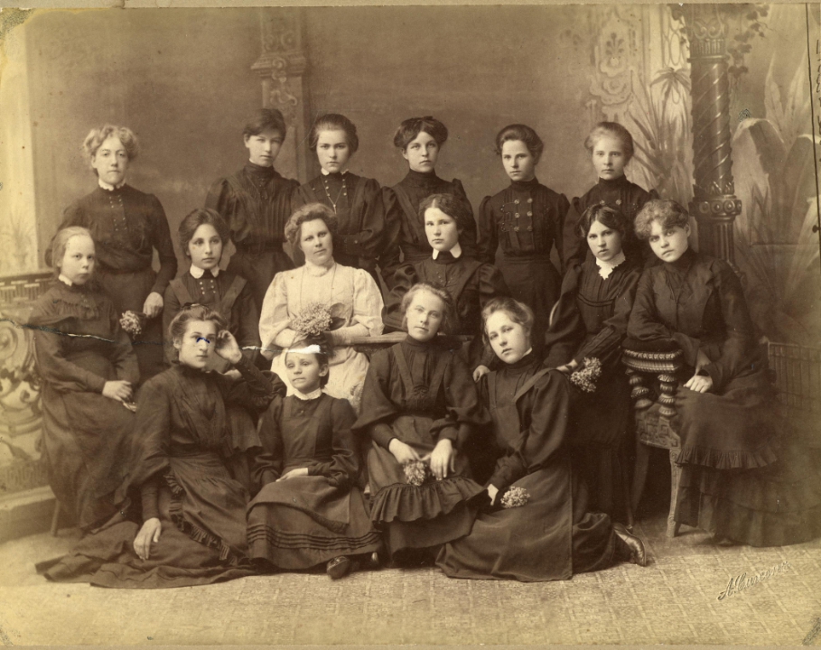 Наталия Павловна Дурдина с матерью и неизвестными женщинами у лестницы перед домом