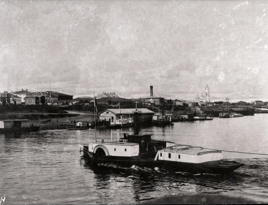 г.Рыбинск. Вид Набережной . Пароход "Паромщик" идет поперек Волги