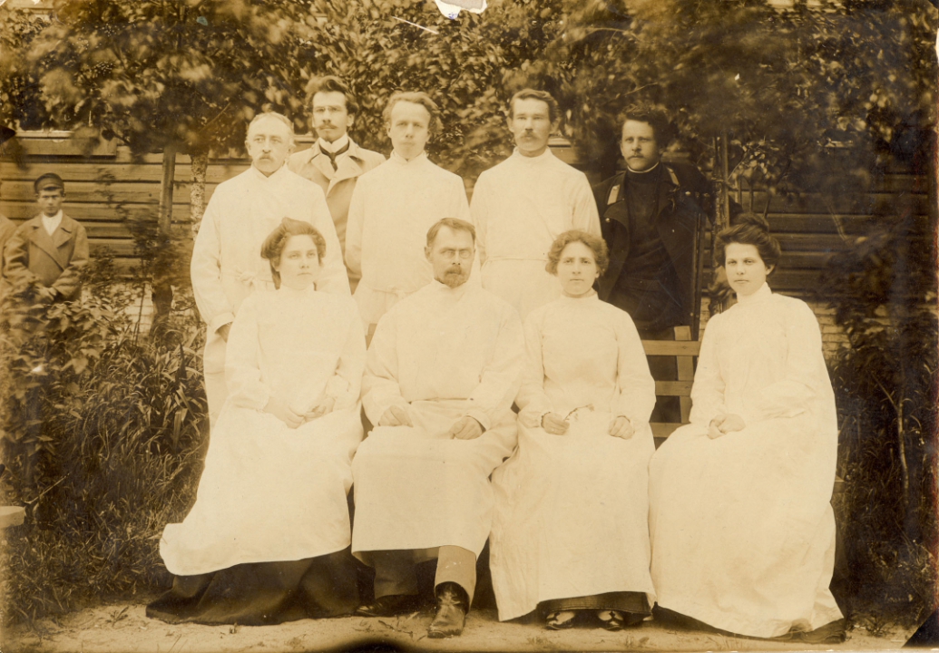Наталия Павловна Дурдина с матерью и неизвестными женщинами у лестницы перед домом