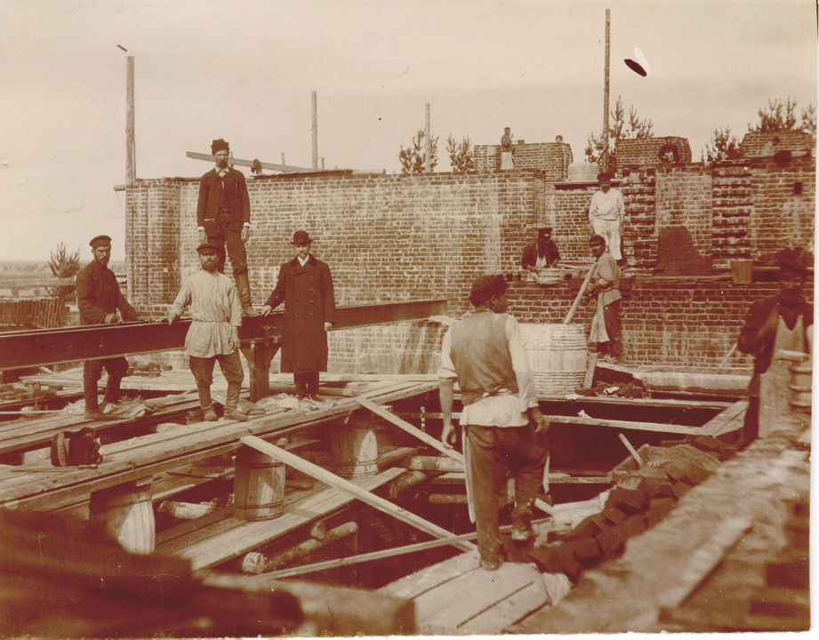 Вид на строительную площадку со строителями.