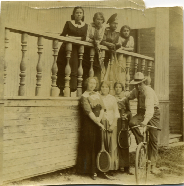Наталия Павловна Дурдина с матерью и неизвестными женщинами у лестницы перед домом