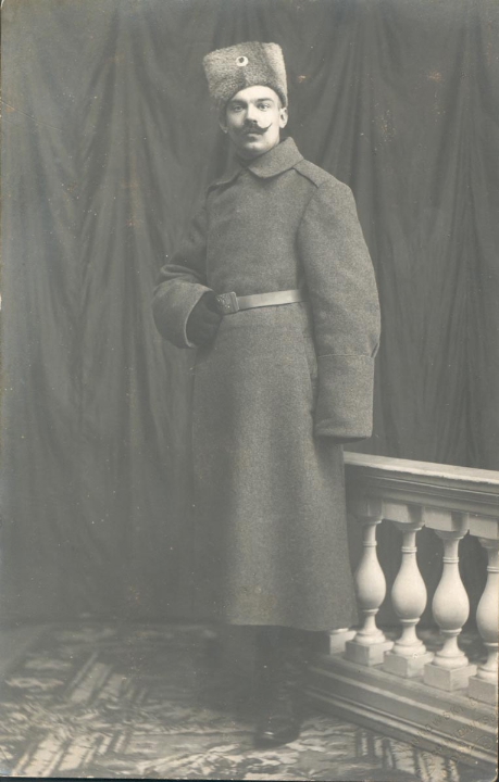 А.Владычук, конторщик фарфоровой фабрики Кузнецова в поселке Песочное в военной форме солдата