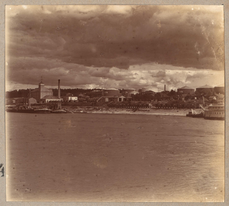 Вид с Волги на нефтяные склады товарищества "Бр. Нобель" и мельницу Галунова в районе Копаева
