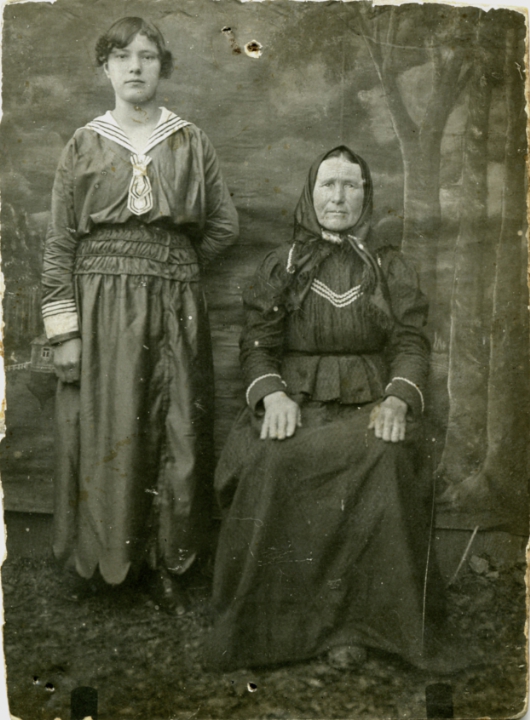 Наталия Павловна Дурдина с матерью и неизвестными женщинами у лестницы перед домом