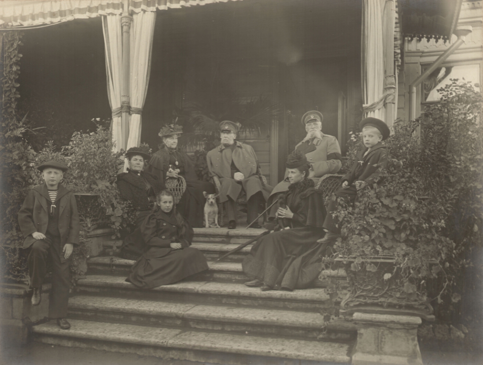 Наталия Павловна Дурдина с матерью и неизвестными женщинами у лестницы перед домом