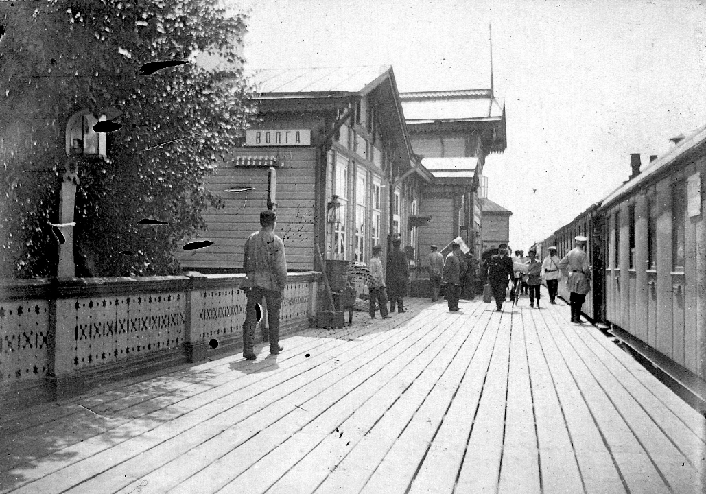 Поезд у дощатого перрона на станции "Волга"