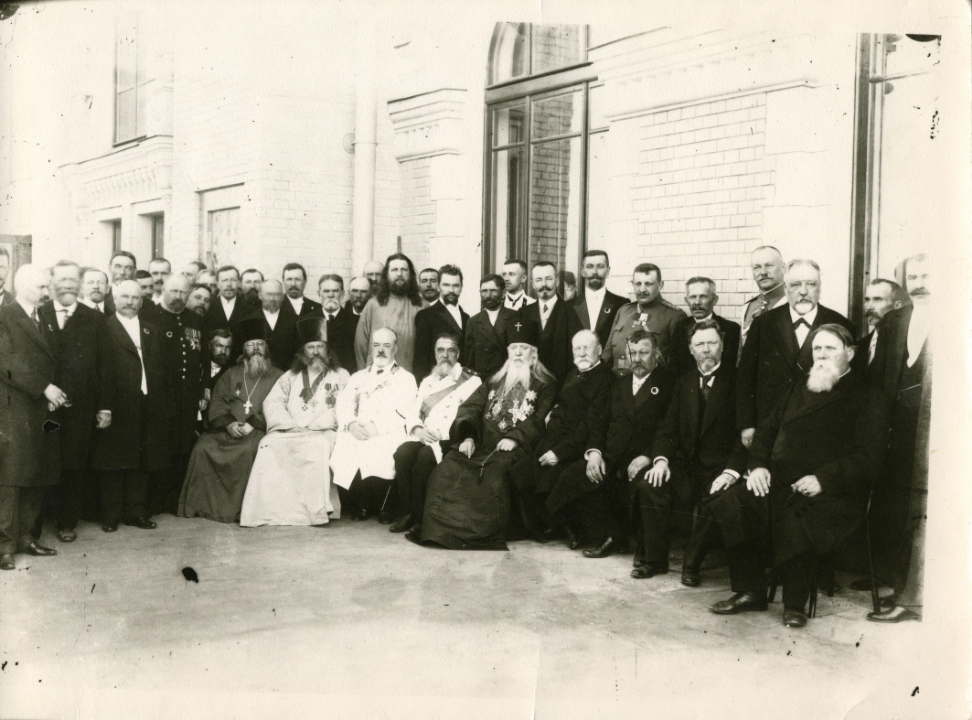 Рыбинск. Большая группа мужчин на балконе биржи