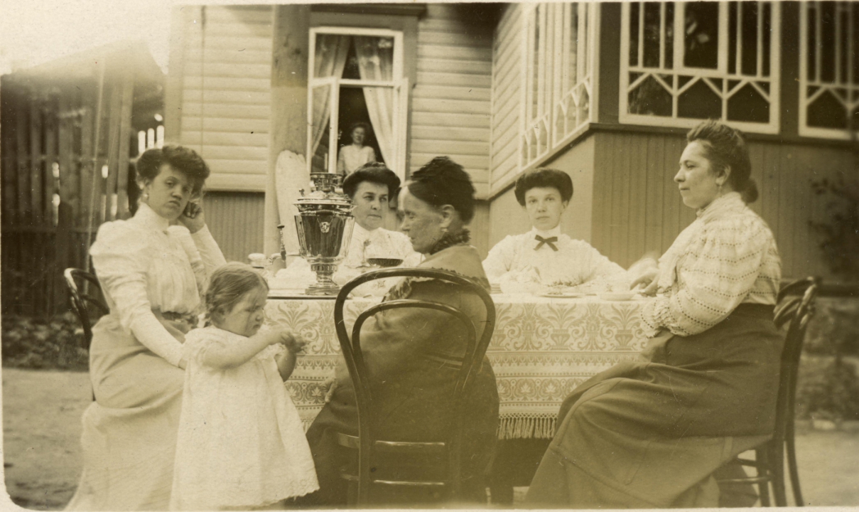 Наталия Павловна Дурдина с неизвестными женщинами за столом на даче
