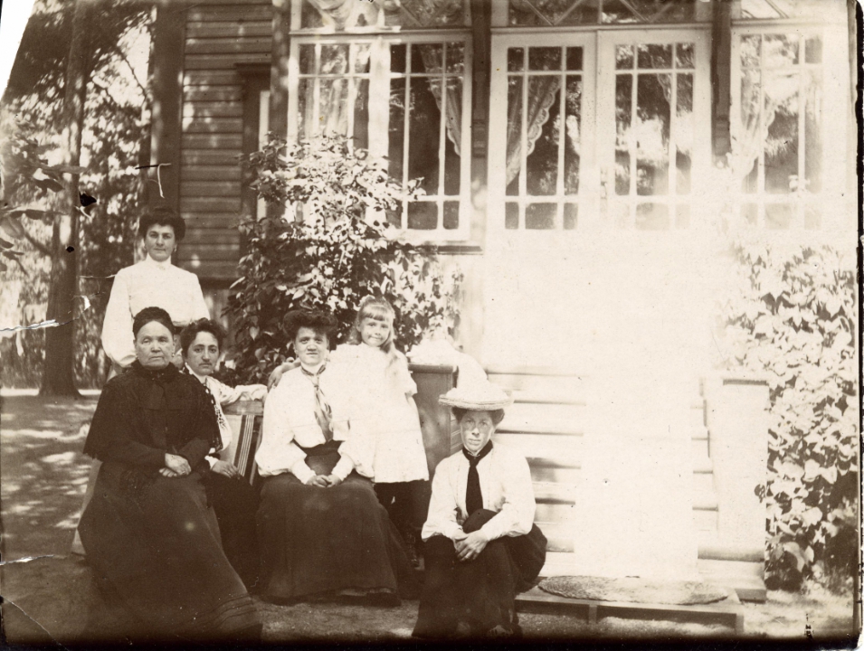 Наталия Павловна Дурдина с матерью и неизвестными женщинами у лестницы перед домом
