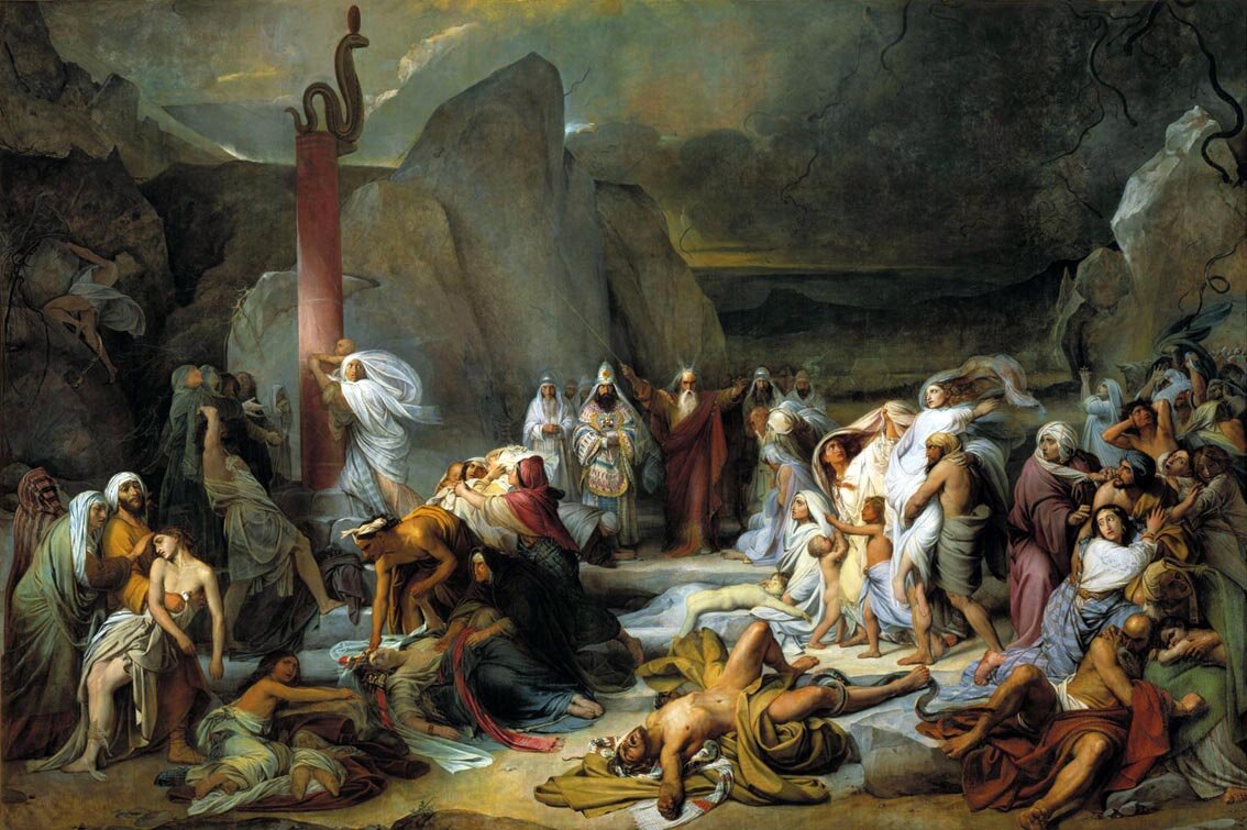 [4] От горы Ор отправились они путем Чермного моря, чтобы миновать землю Едома. [5] И стал малодушествовать народ на пути, и говорил народ против Бога и против Моисея: зачем вывели вы нас из Египта, чтоб умереть нам в пустыне, ибо здесь нет ни хлеба, ни воды, и душе нашей опротивела эта негодная пища. [6] И послал Господь на народ ядовитых змеев, которые жалили народ, и умерло множество народа из сынов Израилевых. [7] И пришел народ к Моисею и сказал: согрешили мы, что говорили против Господа и против тебя; помолись Господу, чтоб Он удалил от нас змеев. И помолился Моисей о народе. [8] И сказал Господь Моисею: сделай себе змея и выставь его на знамя, и ужаленный, взглянув на него, останется жив. [9] И сделал Моисей медного змея и выставил его на знамя, и когда змей ужалил человека, он, взглянув на медного змея, оставался жив.