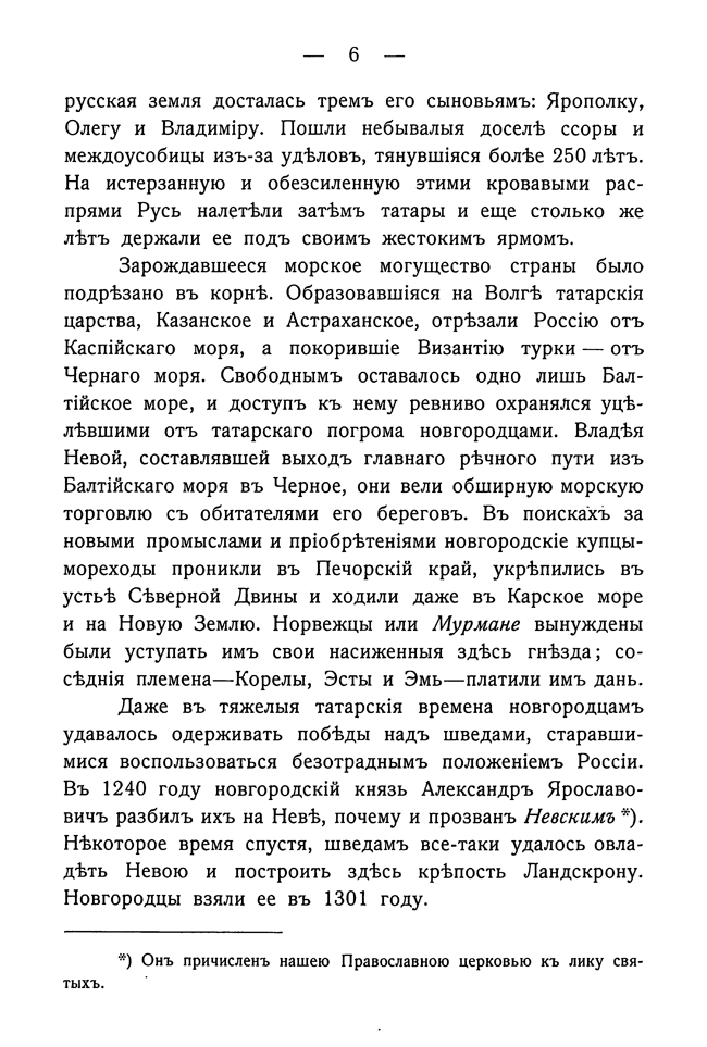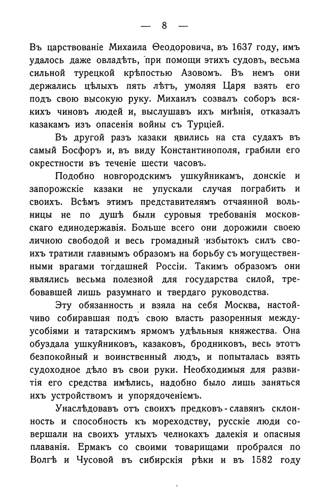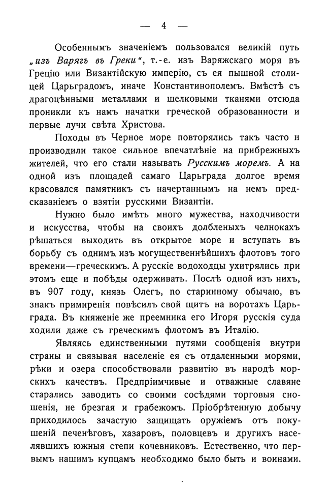 Очерк опубликован в период Русско-японской войны и посвящен выдающейся роли флота в истории России. Автор начинает свой рассказ с 865 года, когда русские лодки неожиданно появились под стенами Царьграда, восхищается свершениями Петра I и завершает книгу словами искренней тревоги о флоте, терпящем поражение на Дальнем Востоке, и призывом к его скорейшему возрождению.