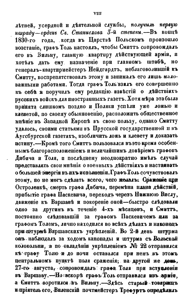 Эта книга долгое время считалась наиболее ценнной биографией великого русского полководца. Несмотря на название, основное внимание уделено имено жизни самого Суворова, Для себя Смитт выдвинул следующие цели: 1) изобразить правдиво падение Польской республики и, в тоже время, жизнь и подвиги Суворова 2) опровергнуть ложное мнение о Суворове, существовавшее в Западной Европе и, особенно, Германии 3) показать актами и документами истинное величие такого человека, как Суворов. Со всеми этими задачами автор вполне справился.