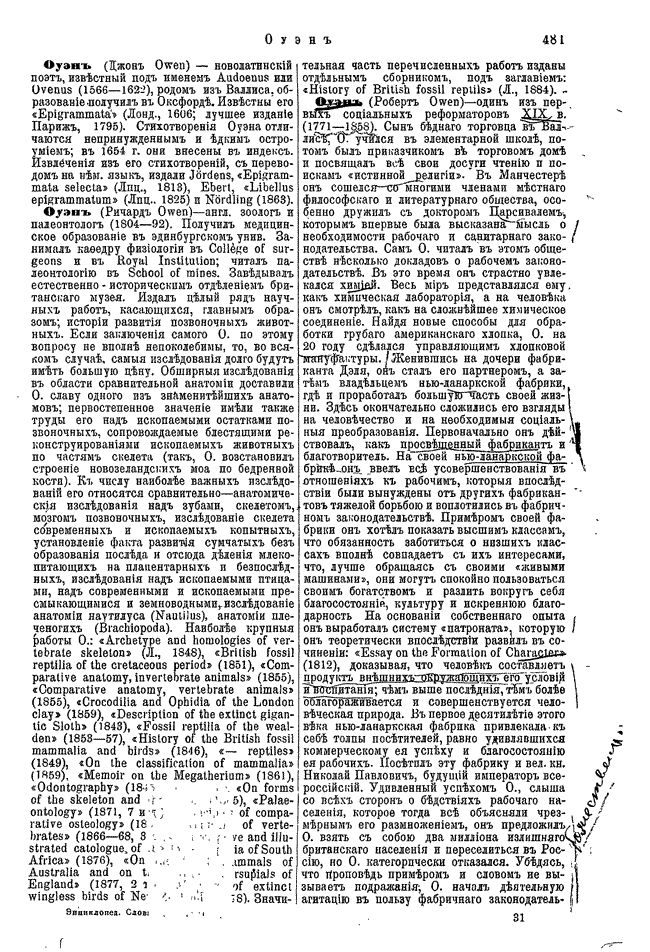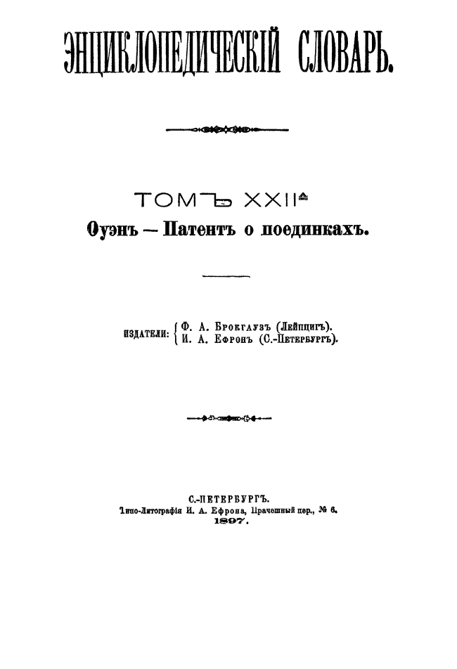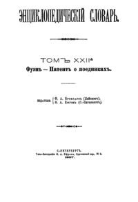 Самая крупная дореволюционная русская универсальная энциклопедия, выпущенная акционерным издательским обществом «Ф. А. Брокгауз — И. А. Ефрон». Состоит из 86 томов (82 основных и 4 дополнительных), выходивших в течение 1890-1907 годов. Первые 8 томов (до буквы «В») вышли под общей редакцией профессора И. Е. Андреевского и в основном содержали переводы на русский язык статей знаменитой немецкой энциклопедии Брокгауза «Konversations Lexikon».