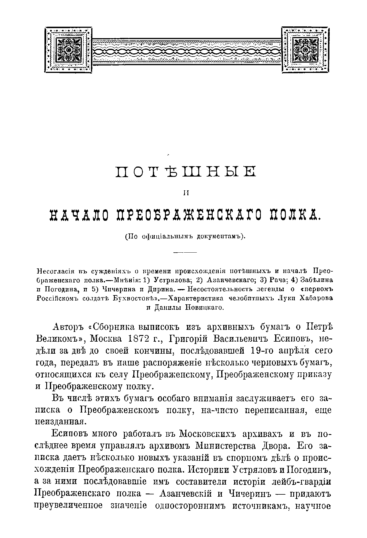 Документальное исследование истории образования «Потешных» войск и переформирования их в солдатский Преображенский полк в период 1682 – 1700 годов. Приведены описания организации, структуры, обмундирования, вооружения и т.п.