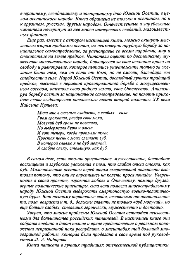 Автором настоящей книги является очевидец и активный участник событий, который в течение восьми труднейших лет (1993-2001) руководил Республикой Южная Осетия сперва в качестве Председателя Верховного Совета, а затем Президента республики. Анализ общественно-политической обстановки, межнациональных отношений в Южной Осетии и Грузии чередуются с интересными экскурсами в историю, философию и юриспруденцию. Они, в свою очередь, сменяются авторскими размышлениями о происходивших событиях в Южной Осетии, Грузии, Российской Федерации, их причинах и следствиях, перспективах решения сложившихся проблем, накопившихся за многие годы.