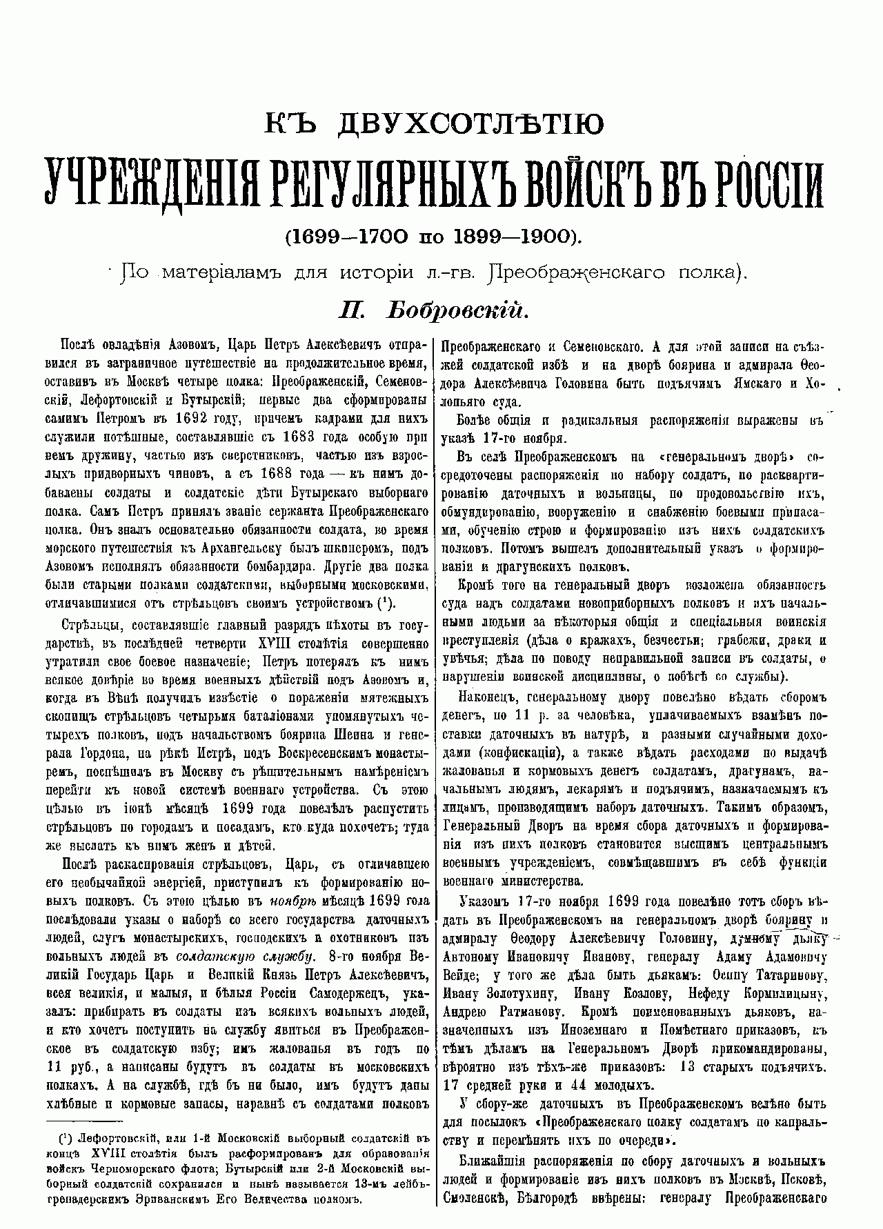 Данный добротный научно-популярный очерк-буклет был подготовлен выдающимся отечественным военным историком генералом П.О. Бобровским. Его издание было приурочено к празднованию 200-летия создания регулярных вооруженных сил в России в царствование Петра Великого. Данная брошюра основана на материалах, собранных автором для написания многотомной полковой истории Преображенского полка. Работа над историей первого и самого известного лейб-гвардии Преображенского полка, с формированием которого связывают рождение новой регулярной русской армии, позволила автору поднять ценный пласт интереснейших исторических сведений не только по специальным вопросам истории строительства вооруженных сил в России, но и малоизвестных фактов о борьбе за власть правительницы Софьи с молодым Петром, о создании им «потешного войска», а также о событиях, завершившихся основанием Санкт-Петербурга и Полтавской битвой, которые вывели Россию в число ведущих держав Европы.