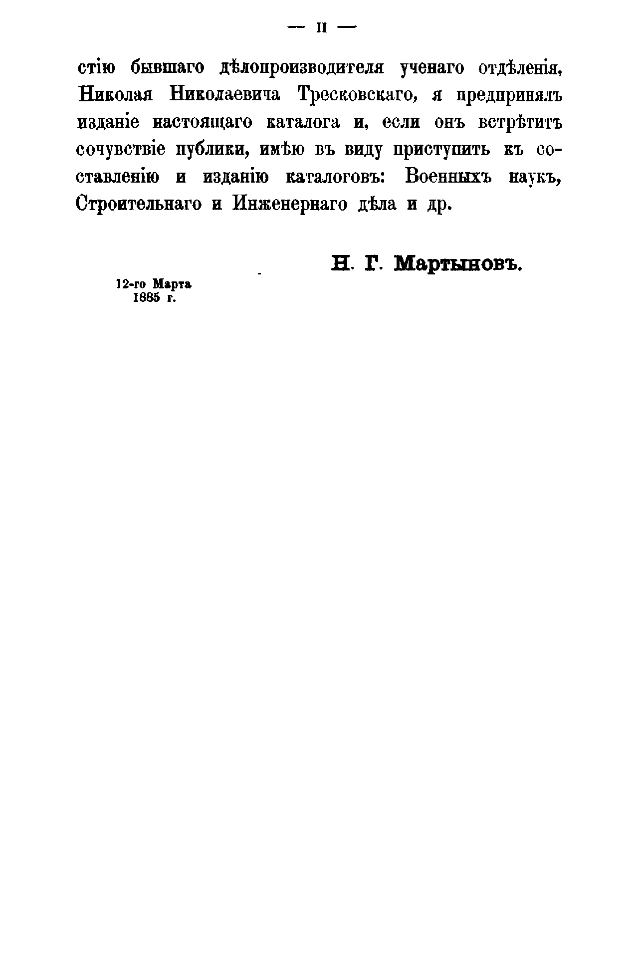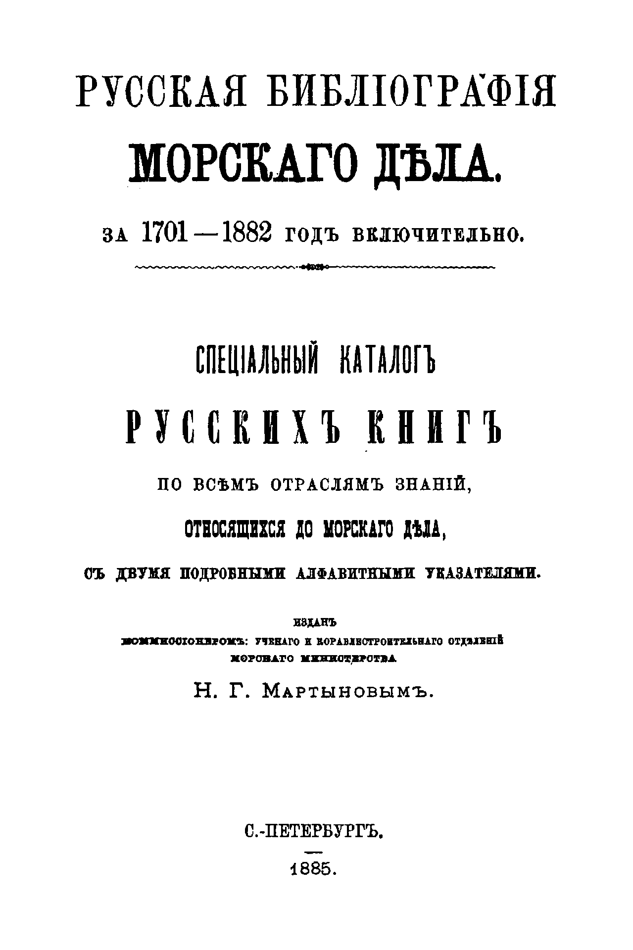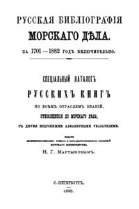 Подробный библиографический справочник по морскому делу, охватывающий описания свыше 2 тысяч 300 наименований книг, брошюр, газетных и журнальных статей, атласов, чертежей и карт за более чем полутора вековой период, был составлен по инициативе военно-морского ведомства России на средства морского технического комитета видным книготорговцем Санкт-Петербурга Николаем Гавриловичем Мартыновым. Особенностью данного издания является то, что справочник содержит значительный объем исследований и другой важной литературы по истории флота и военно-морской истории. Издание снабжено тематическим и именным указателями.